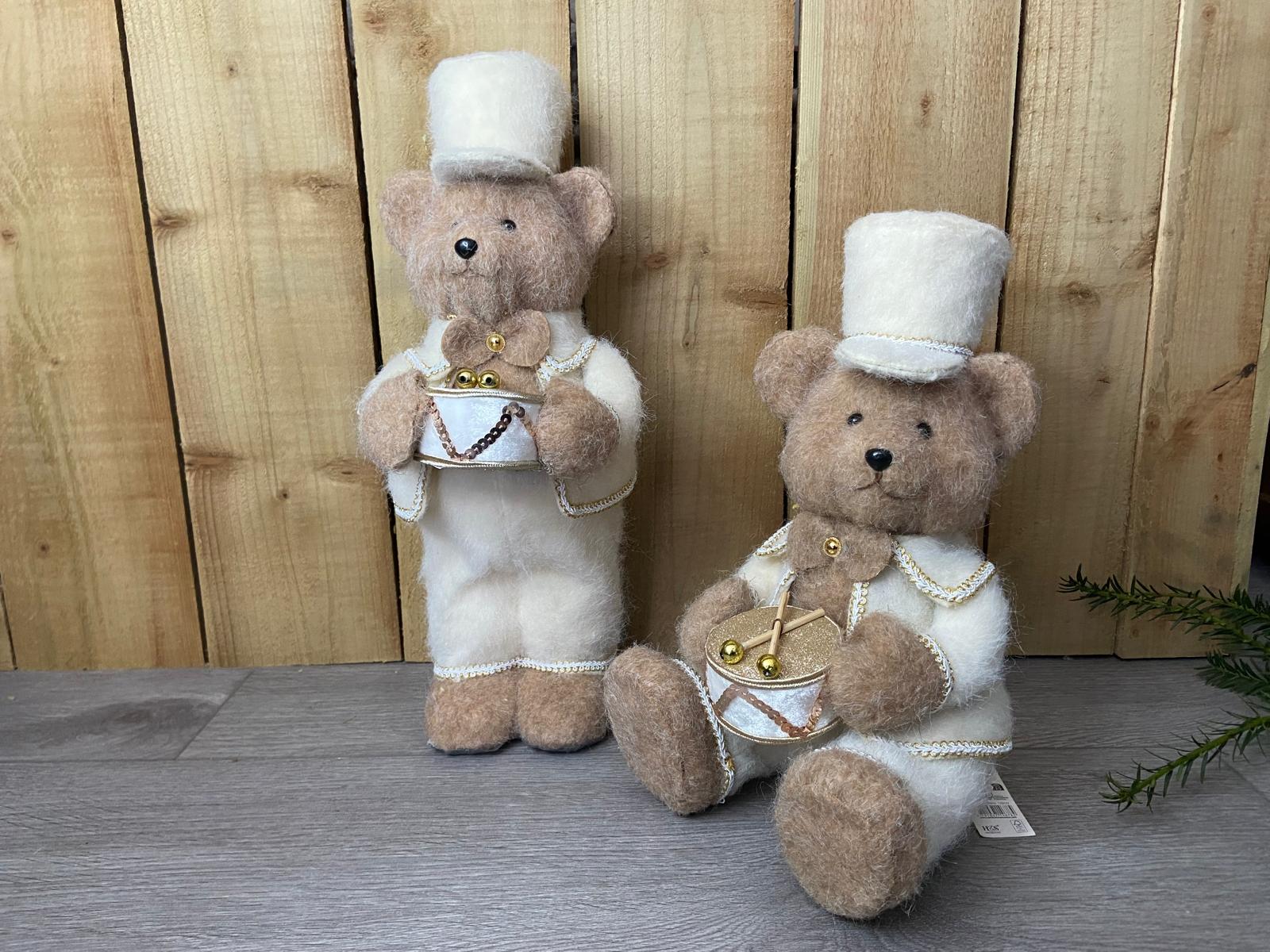 Add a touch of festive charm with these Christmas drummer soldier bears in neutral, gold, and cream tones. The set features one bear standing proudly with his drum and another bear sitting with his drum, both dressed in plush elegant uniforms with delicate gold accents. Perfect for mantel displays, shelves, or as part of your holiday centrepiece, these adorable bears bring a cute and sophisticated touch to your Christmas décor.