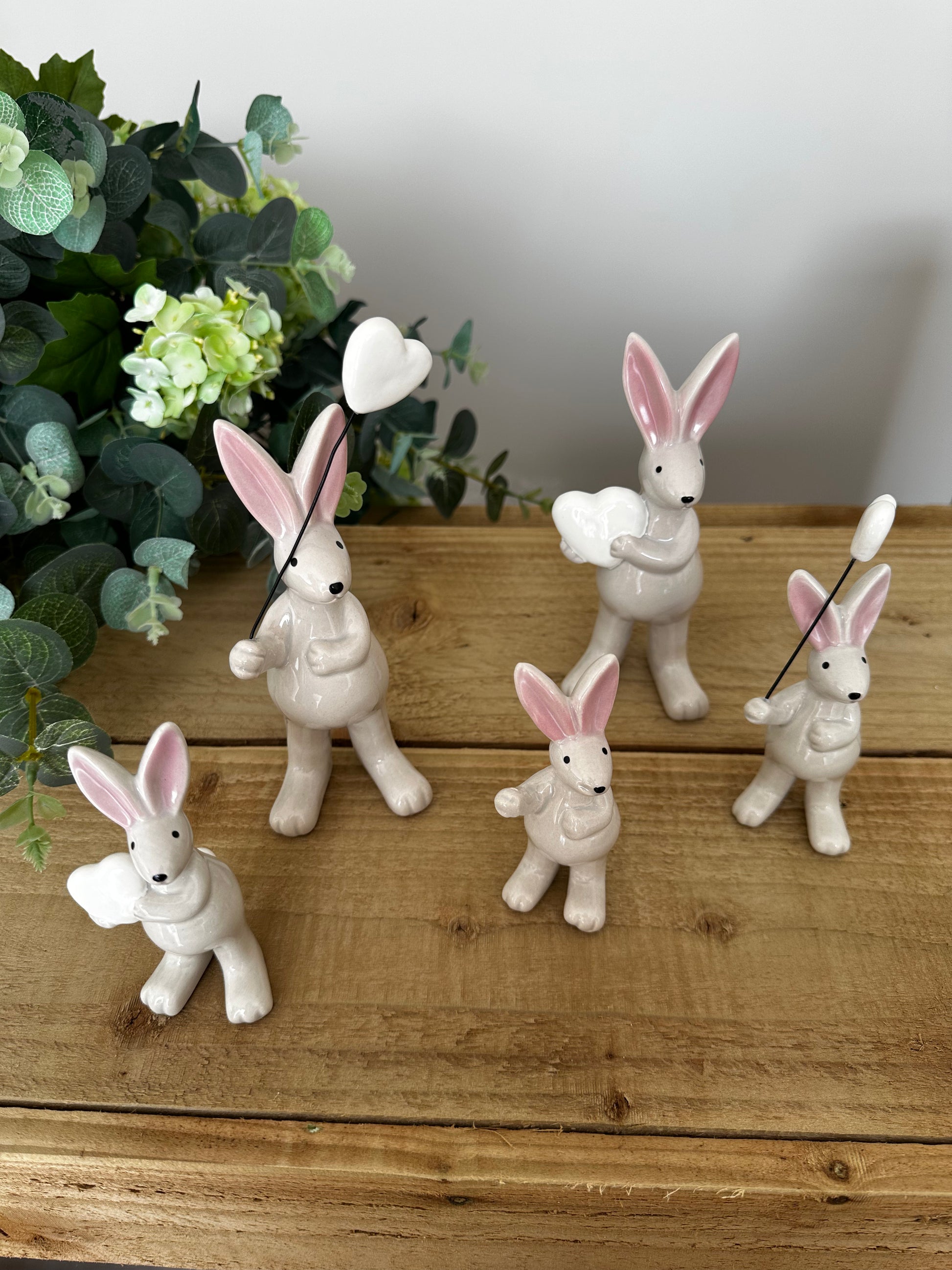 x2 Cute Grey/White Ceramic Rabbits Holding White Heart Balloon on Black Metal Wire (1 large/1 small)