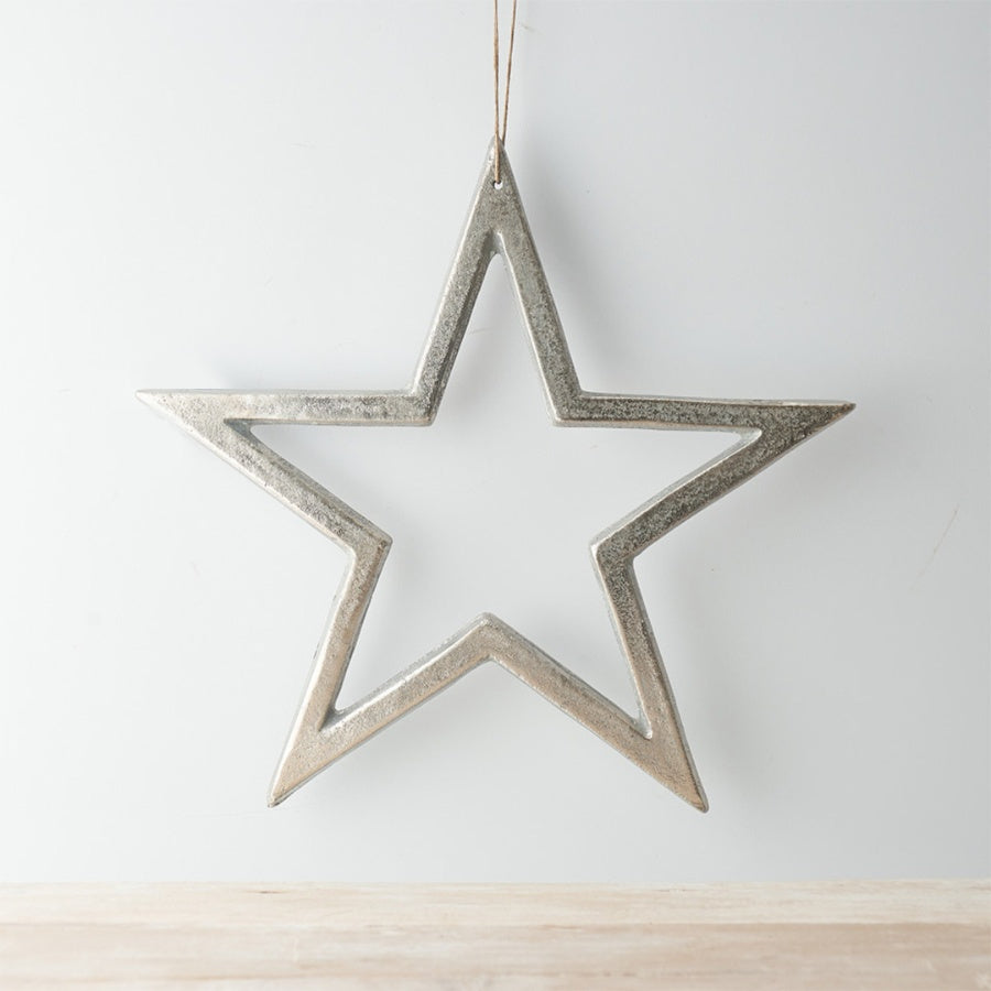 A beautiful and large yet simplistic ornamental star featuring a charming distressed finish and a rustic jute string hanger. Its timeless design makes it a versatile piece that complements any home style.