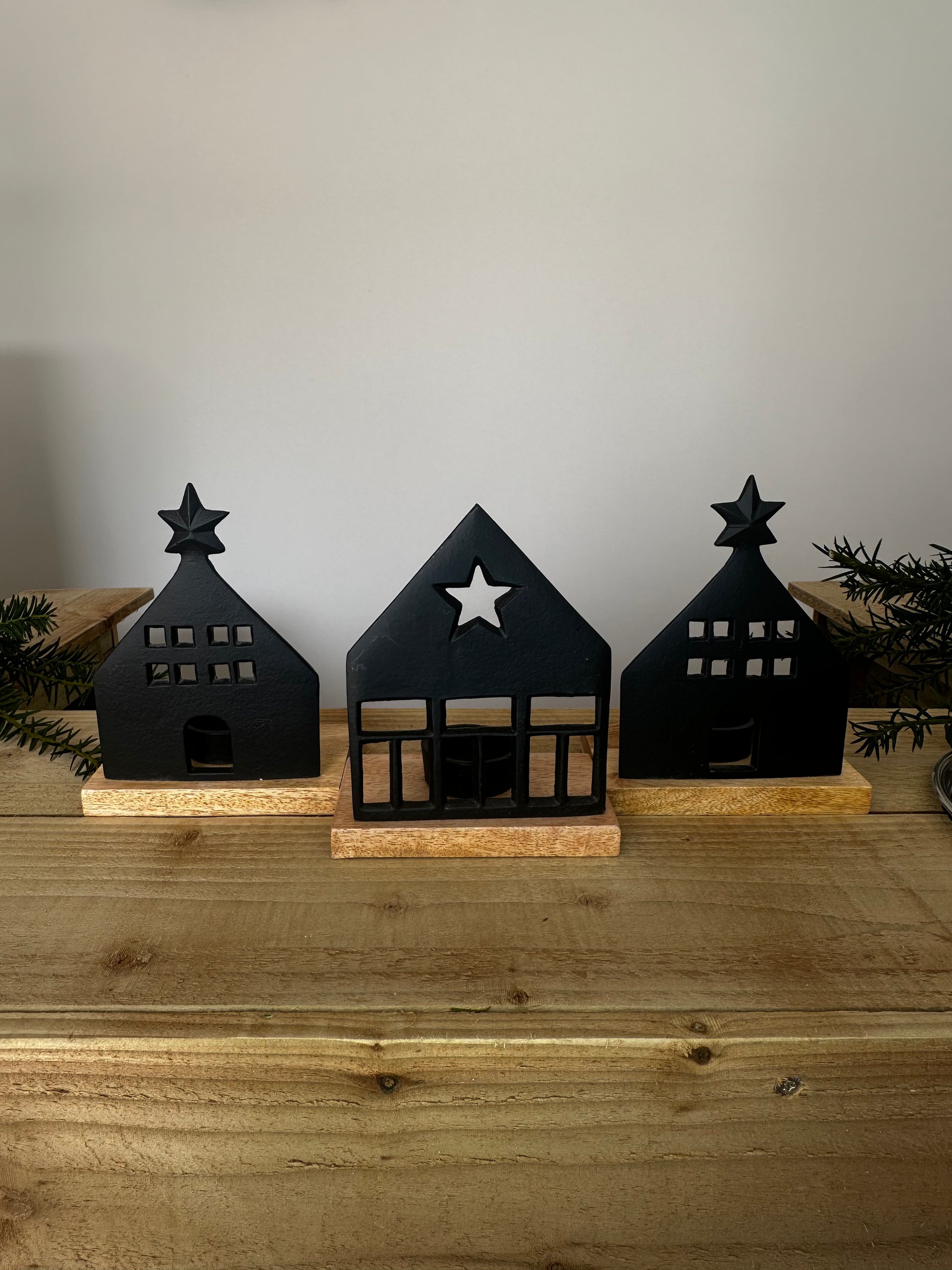 Create a welcoming atmosphere with this set of 3 cosy black aluminium houses. Each house features cut-out windows that cast a warm, inviting glow when a tealight is placed behind, making them perfect for mantels, shelves, and windowsills. The sleek black finish paired with natural wood accents gives these houses a modern yet timeless appeal. Stylish and eye-catching, they add a touch of contemporary charm to any space and are sure to stand out in your seasonal décor.